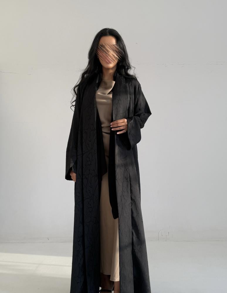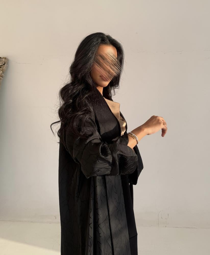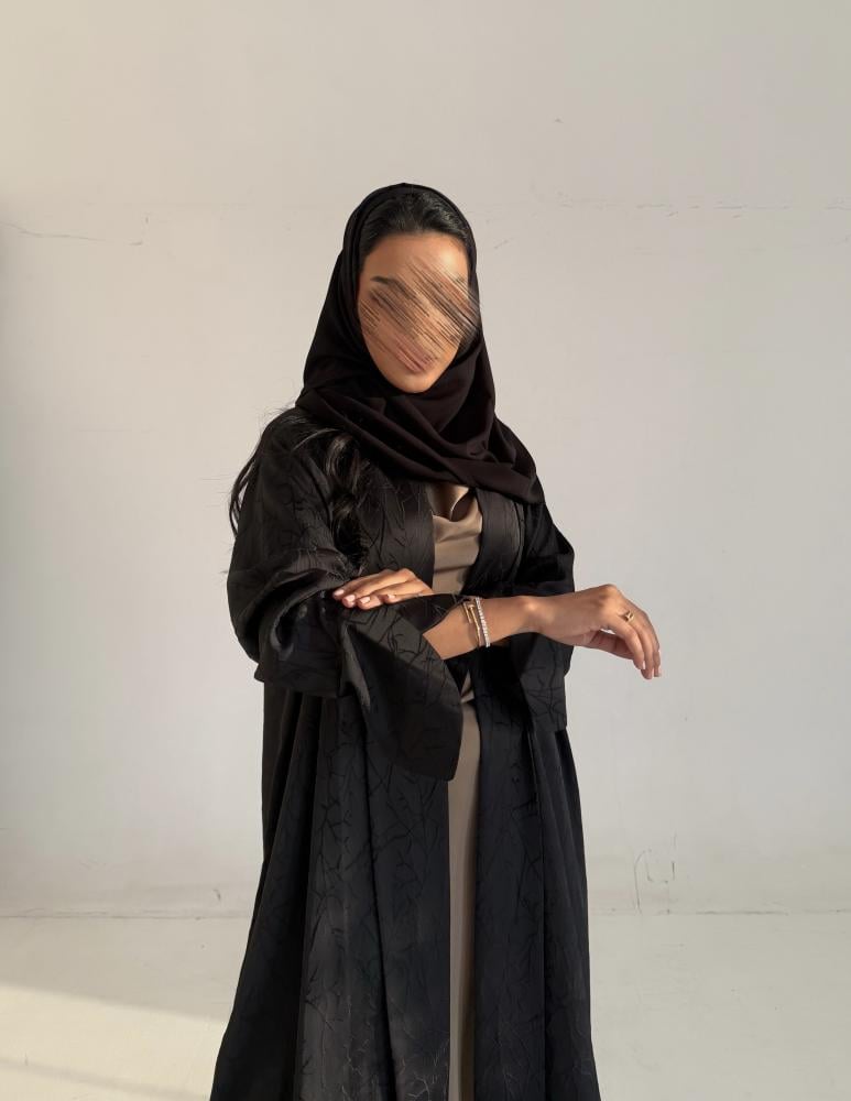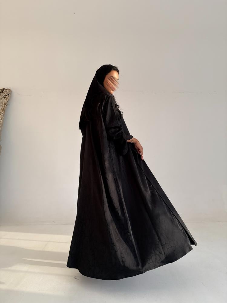 عباية قماش جاكار هندي مع ياقة دبل والقصة كلوش تم تصميمها لتمنحك إطلالة راقية وفخمة، إليك وصفاً مفصلاً لهذه العباية المذهلة: